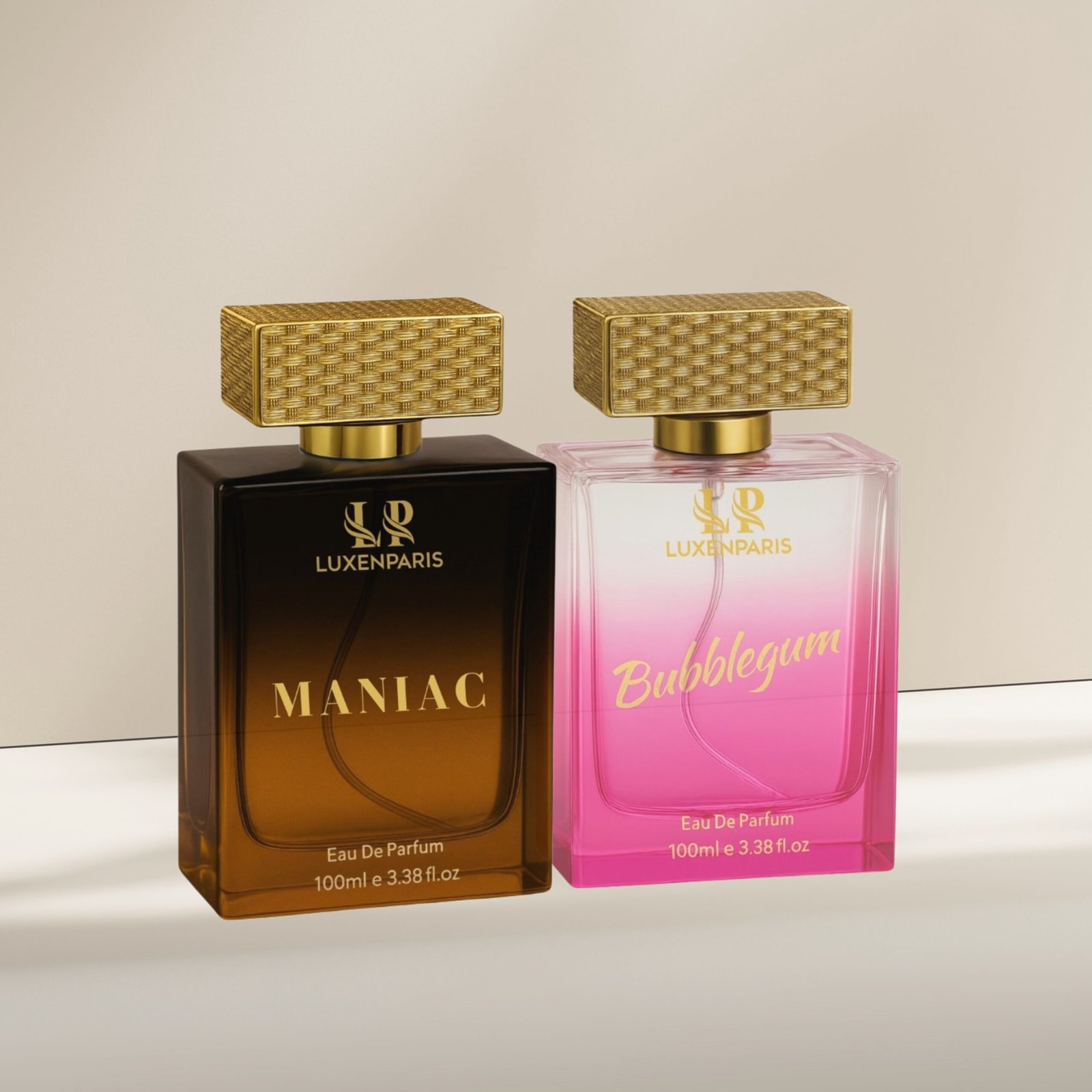 LUXENPARIS Maniac + Bubblegum Perfume Combo (100 ml × 2) – A premium His & Her fragrance set crafted for couples who appreciate elegance. Maniac, for him, is bold and confident, a statement of refined power. Bubblegum, for her, is playful yet sophisticated, a touch of sweetness with modern charm.