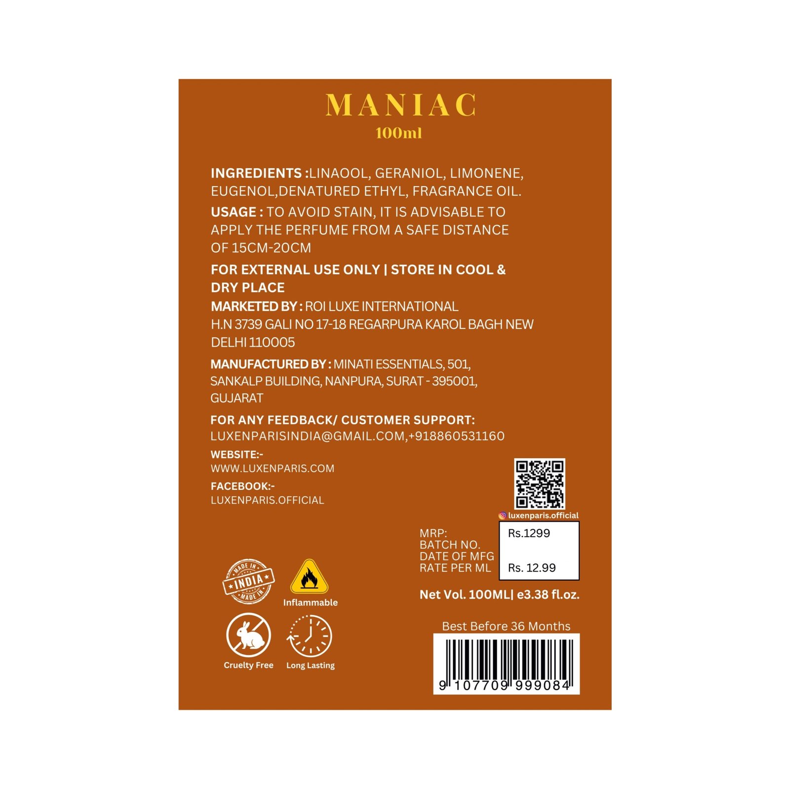 Maniac Eau de Parfum 100 ml | Citrus-Woody Luxury Perfume | LongLasting EDP | Unisex